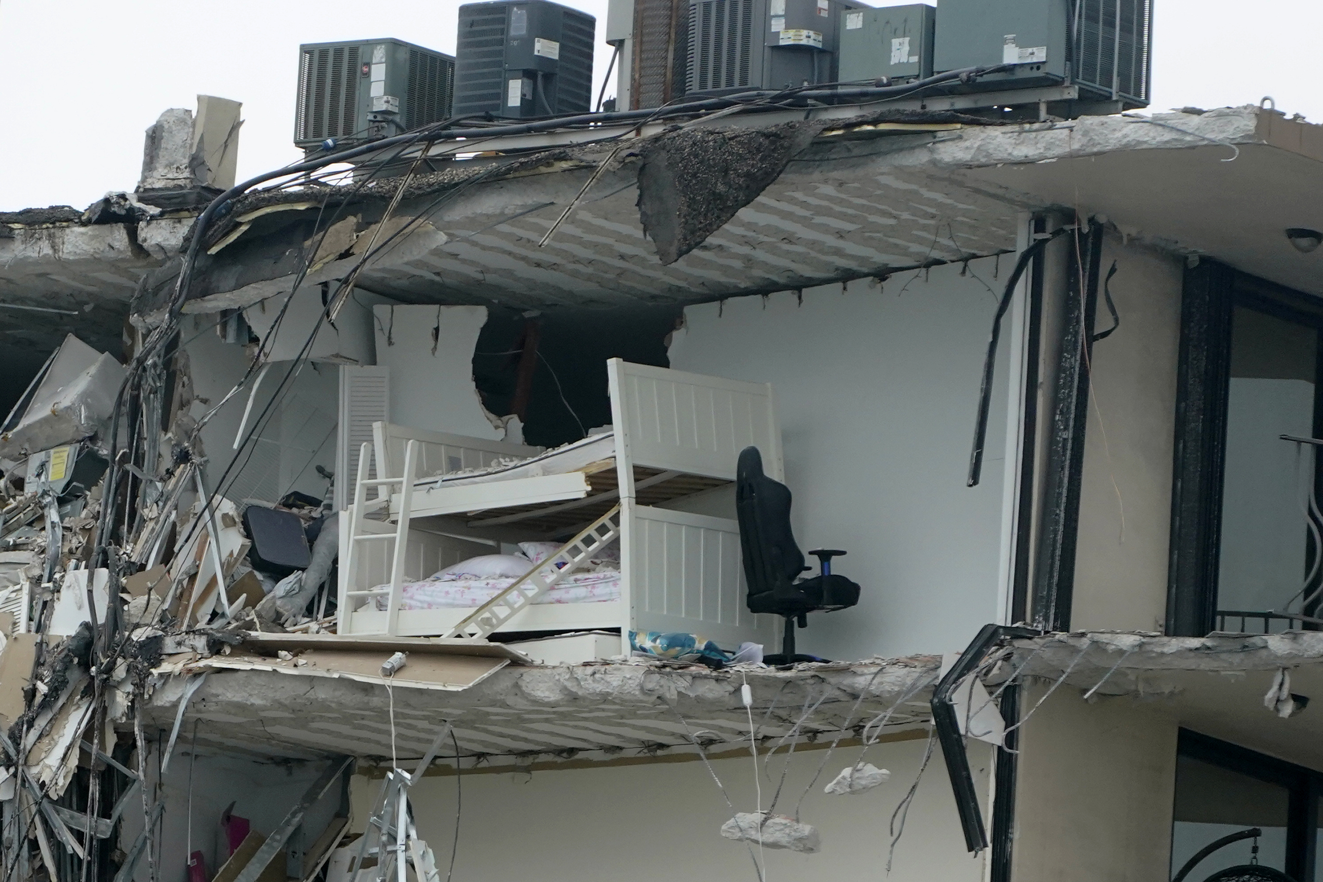 Thursday's partial collapse of the condominium building left the penthouse's interior exposed, with bunk beds and an office chair still intact just inside the broken edge where the rest of the 12-story structure crumbled into a pile of debris.